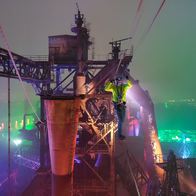 The small group of 10-15 participants starts at the bottom easily, but within a few elements the request raises. After a long section of several cable ropeways You will reach the tube. A huge and steep metal building wich will be climbed by a long via ferrata. All the way up will cost You quite an effort but You will reach the top of the steel mill and enjoy the amazing panorama 50 Meters under Your feet!